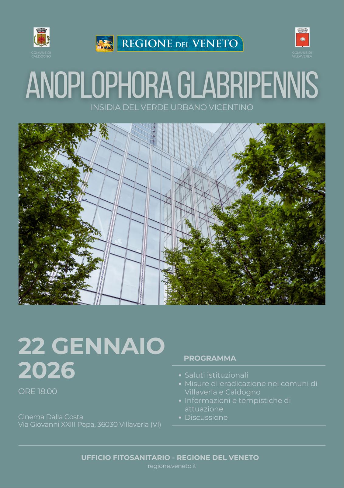 Giovedì 22 gennaio 2026, alle 18:00, presso il cinema-teatro “E. Dalla Costa” in via Giovanni XXIII a Villaverla, si terrà un incontro pubblico per informare la cittadinanza sulle modalità operative del taglio delle specie sensibili all'organismo nocivo da quarantena Anoplophora glabripennis.
