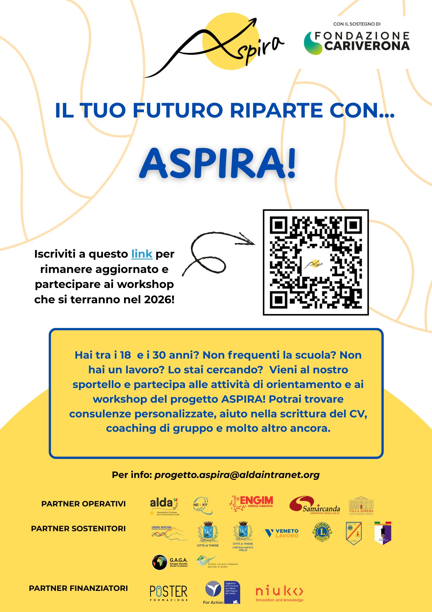 Il progetto ASPIRA! vede Alda Italia APS come capofila, e coinvolge diversi partner. I partner operativi del progetto sono NEXTQ APS, Engim, Samarcanda Onlus e Villa Serena, oltre a diversi partner sostenitori, sia provenienti dal mondo no-profit e della pubblica amministrazione (l’Ufficio Politiche Giovanili del Comune di Thiene, l’Unione Montana Pasubio Piccole Dolomiti, GAGA Vicenza, Fondazione Lions Schio e Thiene, il Centro Italiano Femminile della Provincia di Vicenza, il CPI Schio-Thiene, l’Ufficio d’Ambito per l'Inclusione Sociale ATS_Ven 04) che dal mondo profit (Niuko SRL, For Action SRL, Istituto Poster). ASPIRA! nasce per coinvolgere i giovani dai 18 ai 30 anni del nostro territorio che non studiano, non frequentano corsi di formazione e non lavorano, attraverso laboratori e attività di coaching, fornendo loro strumenti pratici e concreti per aiutarli nell’inserimento sociale e lavorativo. Nel corso del 2026 i ragazzi avranno la possibilità di intraprendere gratuitamente percorsi di orientamento, cicli di coaching e mentoring di gruppo per aiutarli ad identificare le proprie inclinazioni professionali, migliorare le proprie competenze e apprendere come muoversi al meglio nella ricerca di un lavoro.