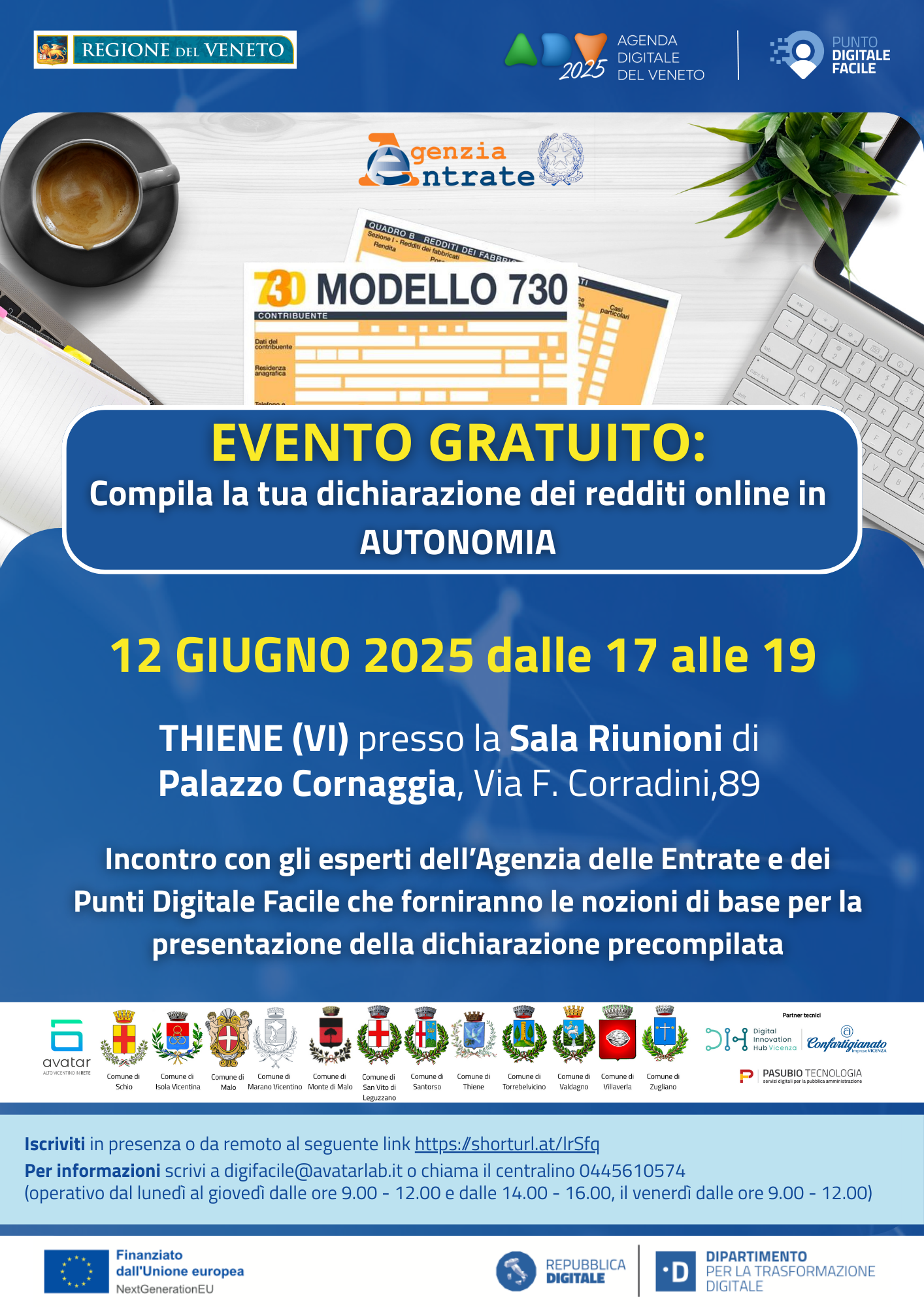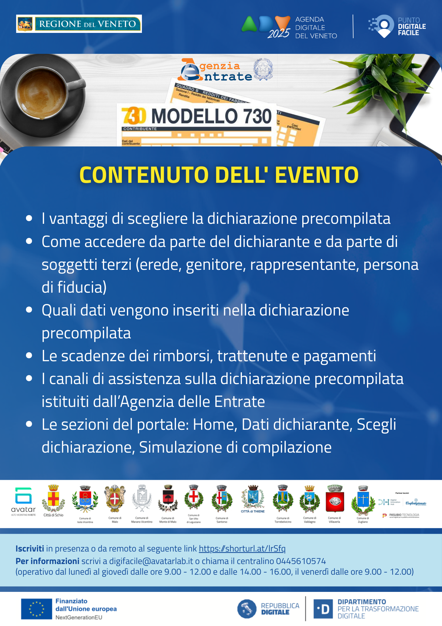 Per maggiori informazioni scrivere a digifacile@avatarlab.it o chiamare il centralino al numero 0445/610574(operativo da lunedì a giovedì dalle ore 9.00 alle ore 12.00 e dalle 14.00 alle 16.00, il venerdì dalle ore 9:00 alle ore 12:00)